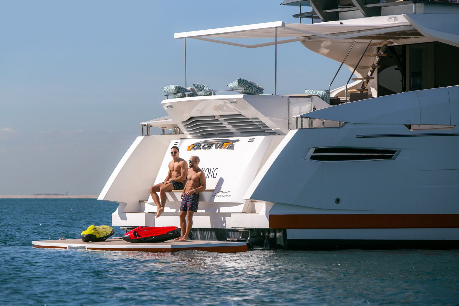Built by Numarine, this 105ft luxury yacht hire will surely offer a memorable sailing fun anywhere in Dubai Marina and the UAE. With an equally alluring and sporty design, high level of functionality and performance, Dolce Vita stands apart among the other party boat rental services. This luxury yacht charter is the perfect choice for private parties and corporate gatherings that require accommodation of up to 25 passengers at a time.