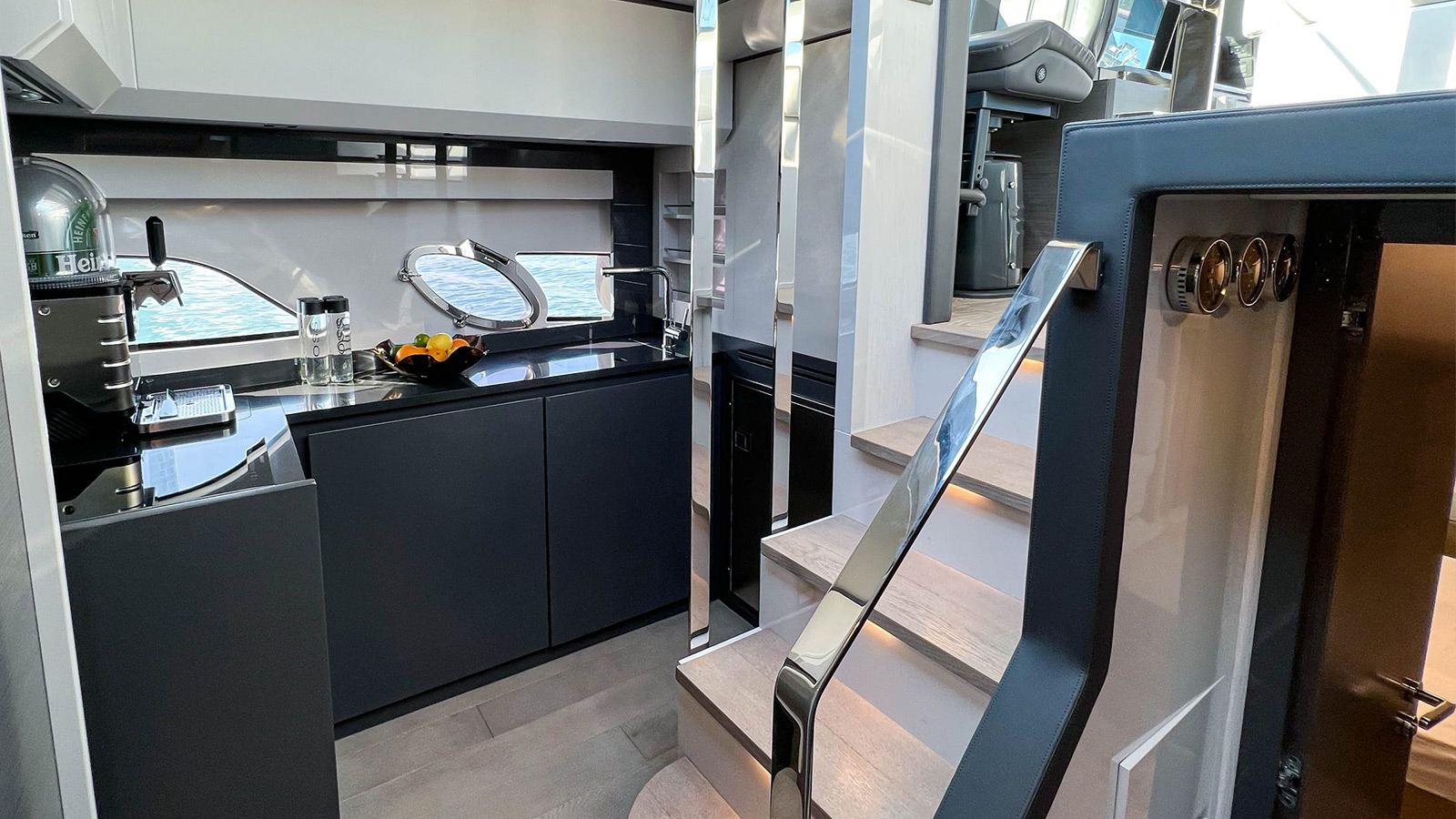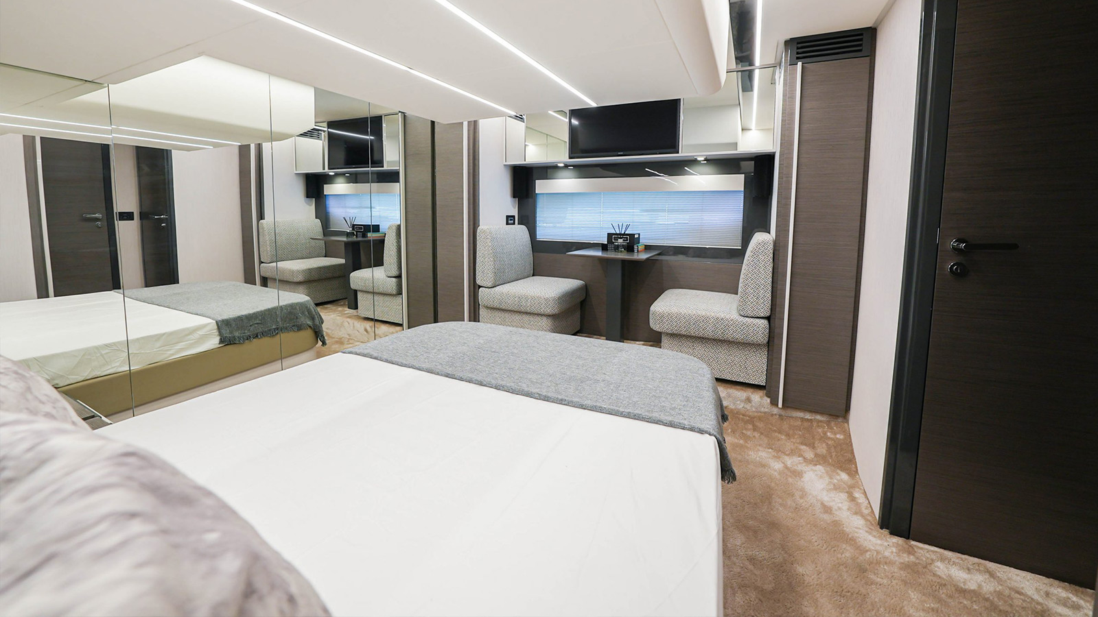 The yacht features 2 elegantly designed cabins, 2 toilets, and 2 showers, complemented by a well-equipped kitchenette and a chic lounging area to relax and enjoy the views.
